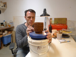 Matt Repsher primarily works with mid fire red stoneware and colored slips. His current body of work is wheel thrown pots with some hand-built additions.