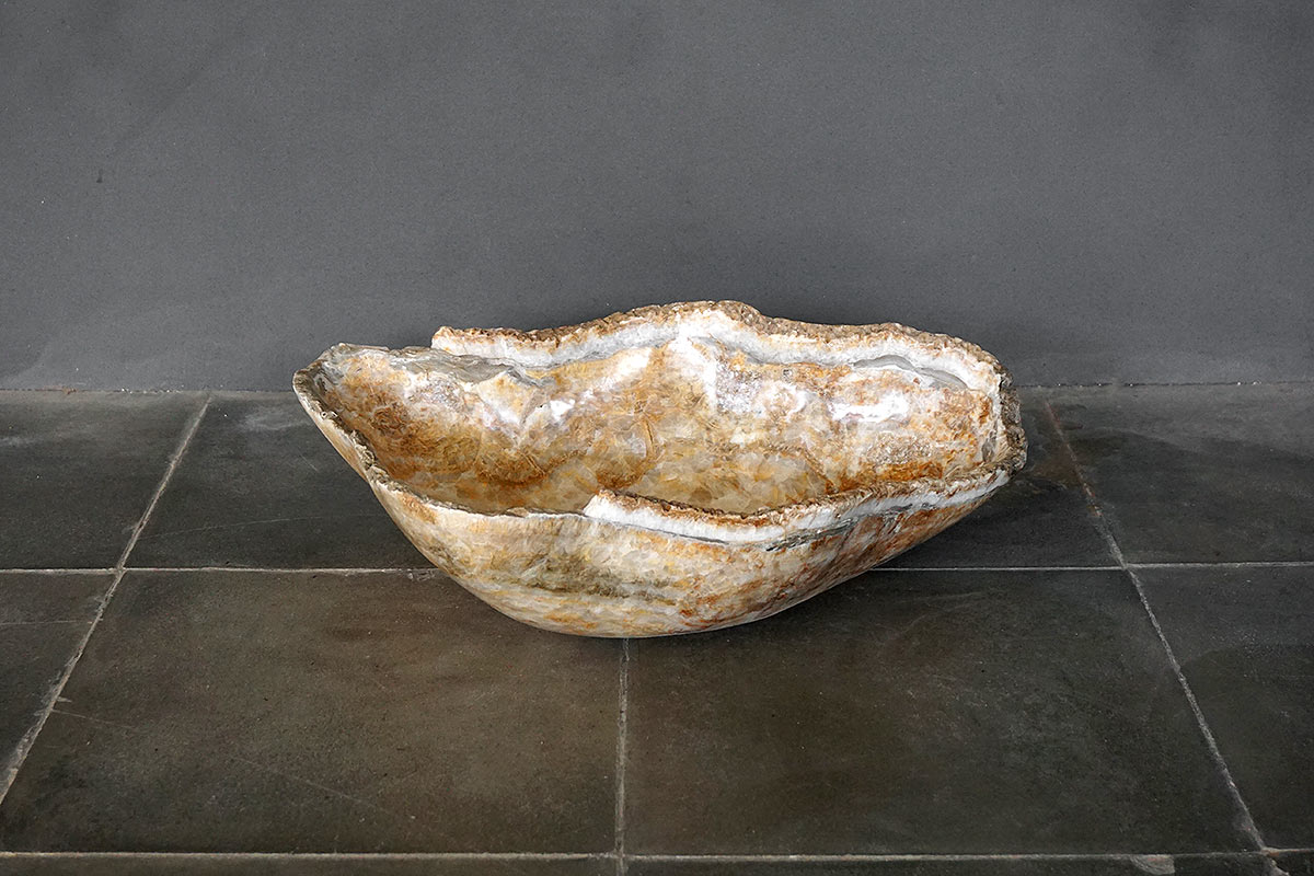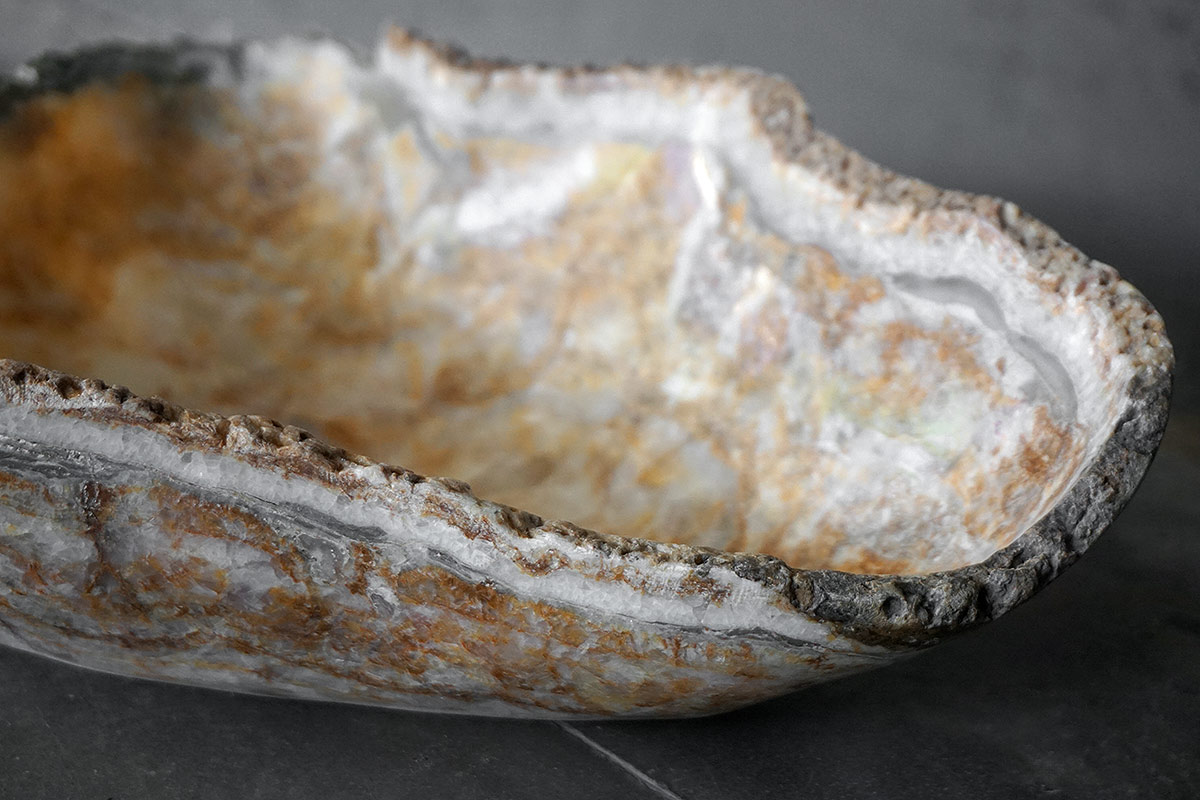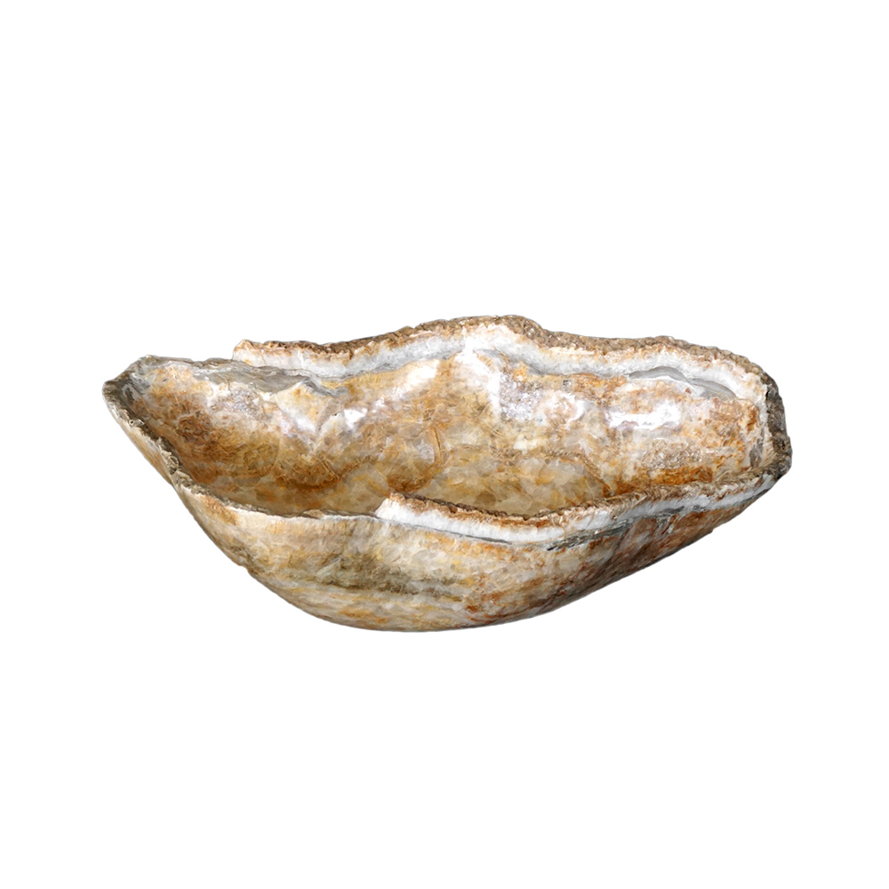 The Raw Edge Natural Onyx Bowl is a one-of-a-kind. Hand-carved from natural banded onyx. Earth-toned bowls boast lovely areas of translucency, veining in warm tans and browns, and a rough exposed edge of the mineral matrix from which each was cut. Each piece may vary in look, size and weight.