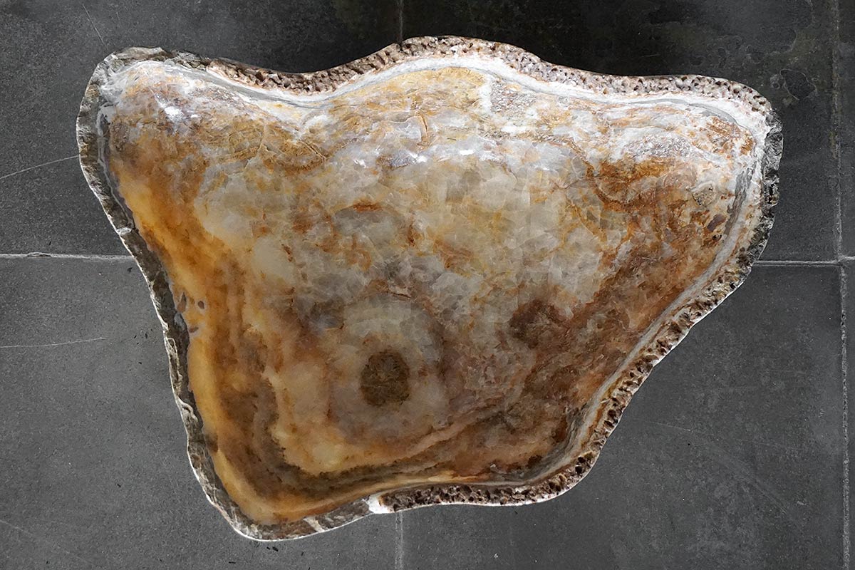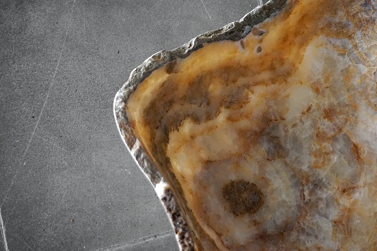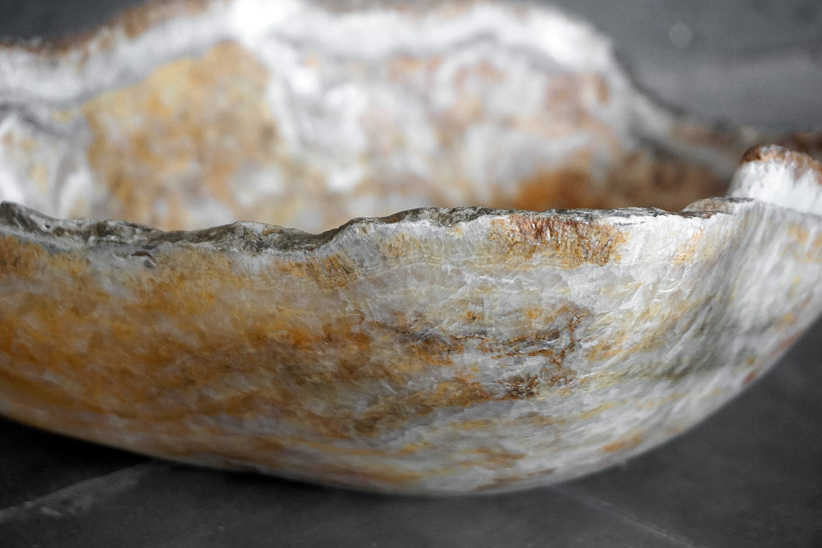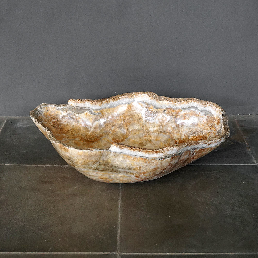 The Raw Edge Natural Onyx Bowl is a one-of-a-kind. Hand-carved from natural banded onyx. Earth-toned bowls boast lovely areas of translucency, veining in warm tans and browns, and a rough exposed edge of the mineral matrix from which each was cut. Each piece may vary in look, size and weight.