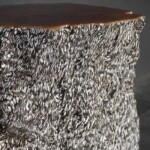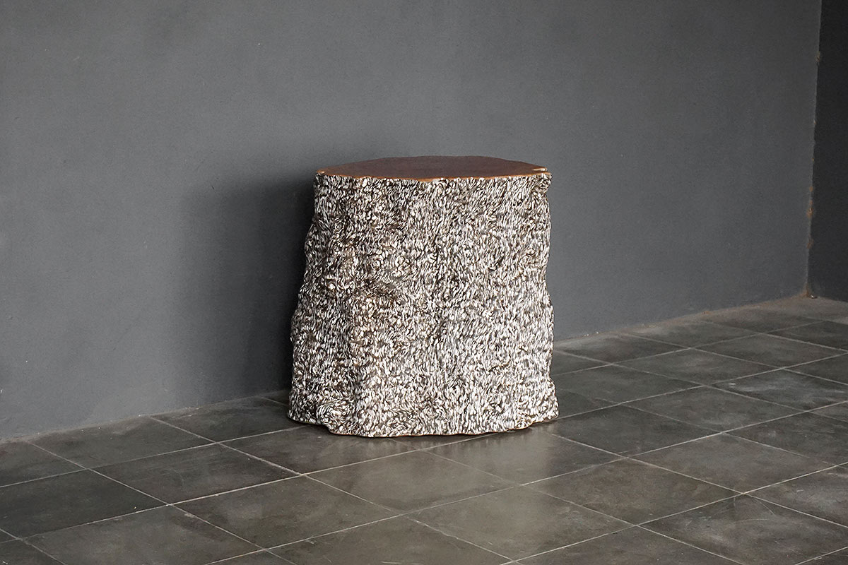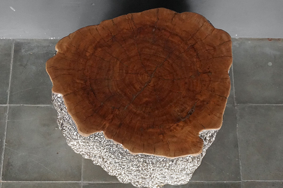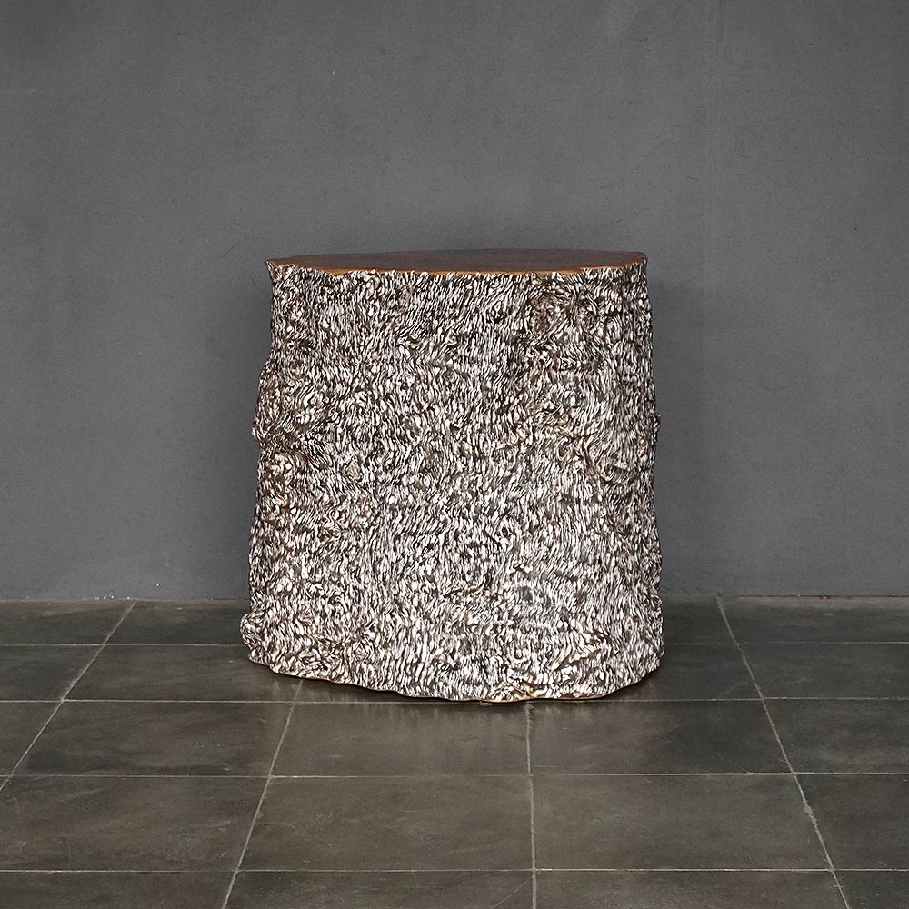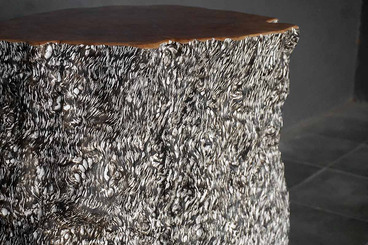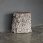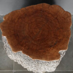 This organic side table is constructed from a large slice of Lychee tree which no longer bears fruit. Each piece is unique due to the nature of the wood grain. Its uniqueness, durability, and aesthetic appeal make it a captivating addition to any home or interior space.
